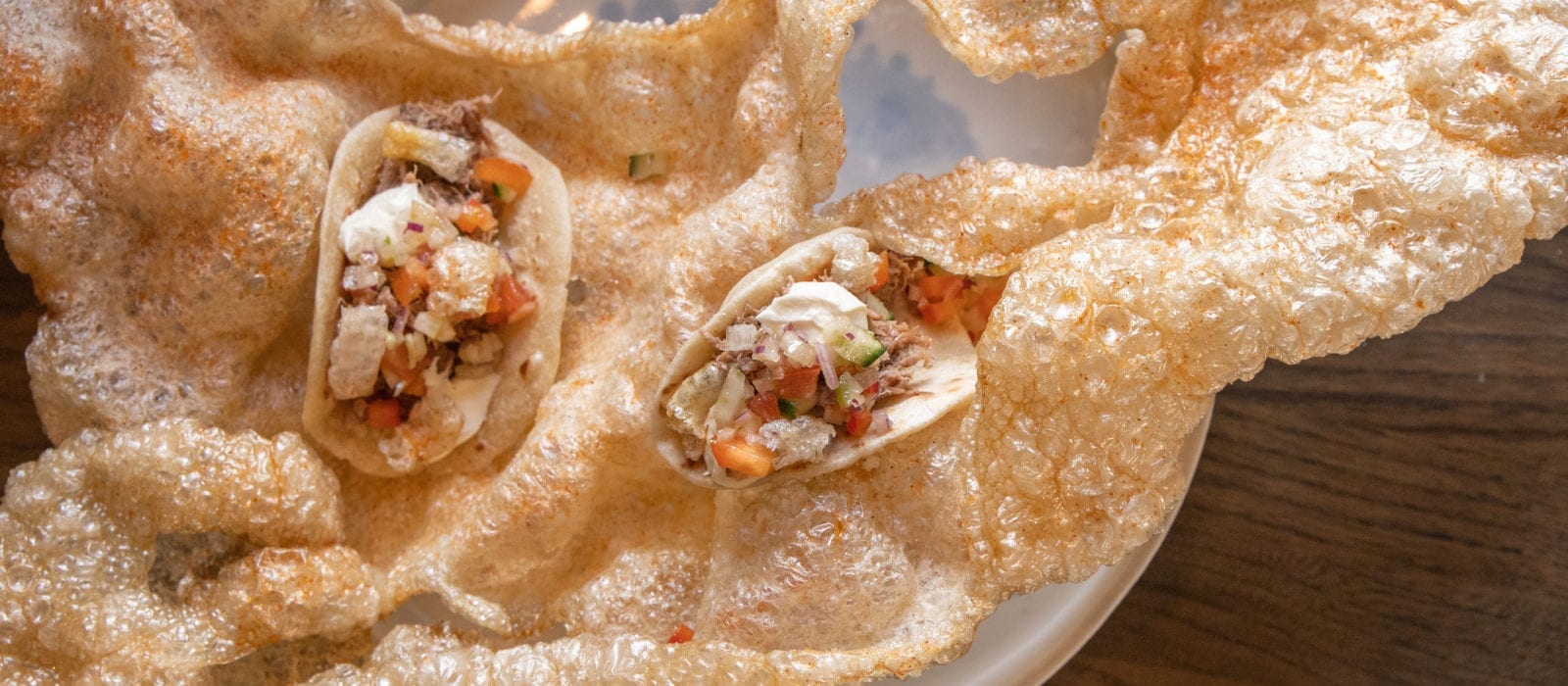 Brasseruð grísakinn á mjúkri hveiti tortilla með Pico De Gallo. Á myndinni eru hún borin fram á stökkri grísapuru.
